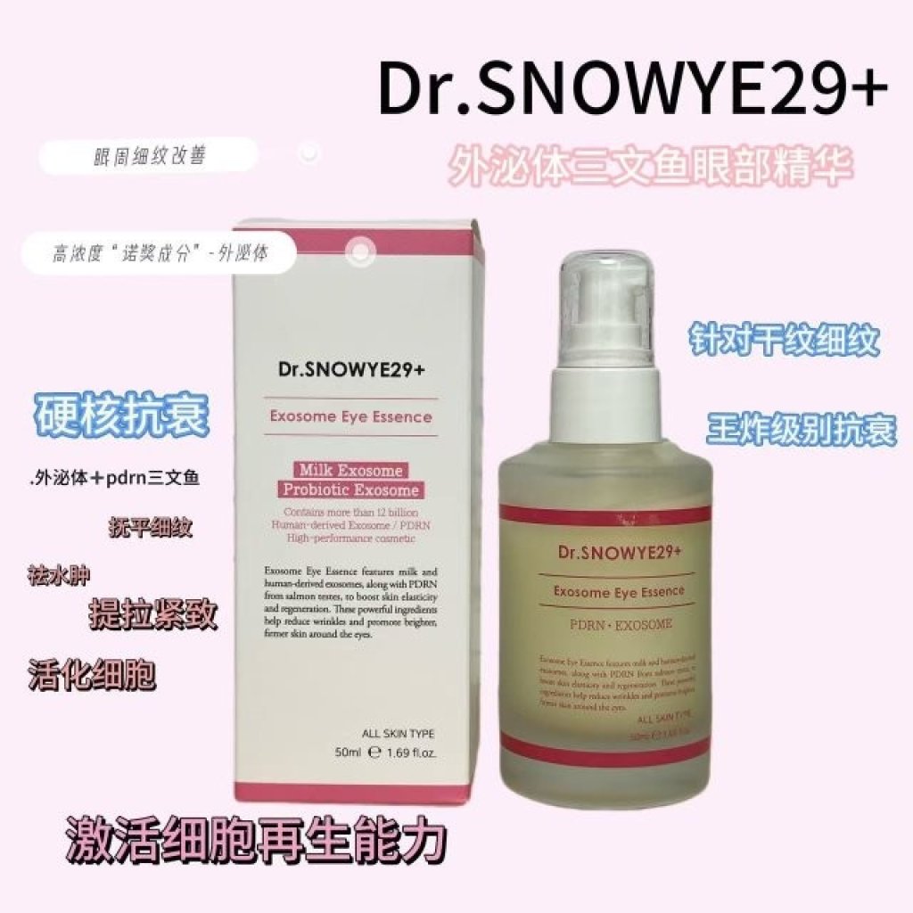 ➡️➡️ "Dr.SNOWYE 29+ Eosome 三文鱼外泌體眼精華" 改善膚質“超強幫手 ” 增强弹性:促進胶原蛋白和弹性蛋白的生成 ,讓肌膚變得緊致 、有弹性 。 舒缓敏感:減輕炎症反應 ,缓解痤瘡和肌膚泛红 ,讓肌膚更平滑穩定 。 對抗衰老“好武器 ” 延缓老化:啟動長期细胞修復,效果可持續數月 抗氧化損傷:減少自由基對皮膚的傷害 ,防止肌膚鬆弛 、干燥和暗沉 。