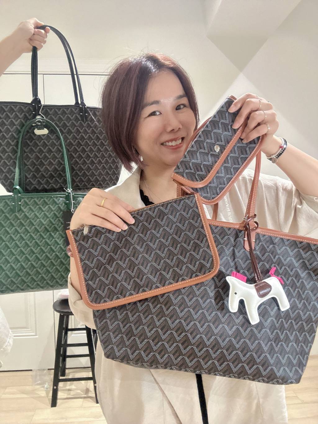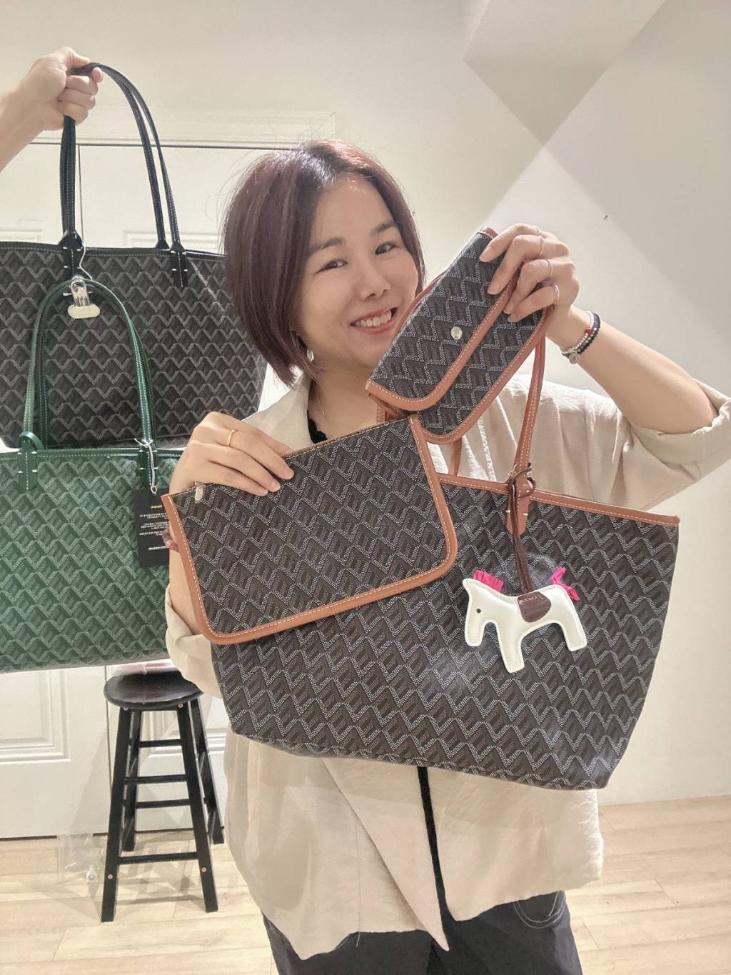 EMO 經典狗牙袋(Goyard-inspired 風格)是韓國品牌的熱門款,以其獨特的狗牙紋(三角幾何圖案)和高性價比著稱。多採用輕便的超纖皮材質,具備防水功能